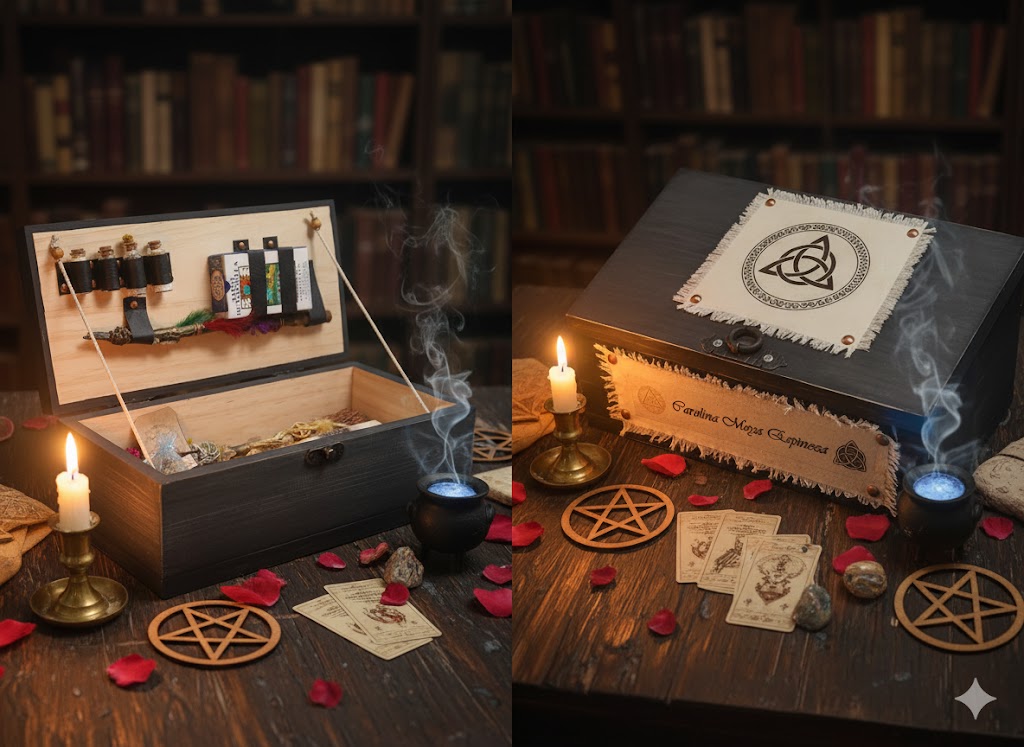 Completo Baúl de Brujas para iniciar tu camino en la magia herbal, además este baúl es un excelente altar para tus rituales.