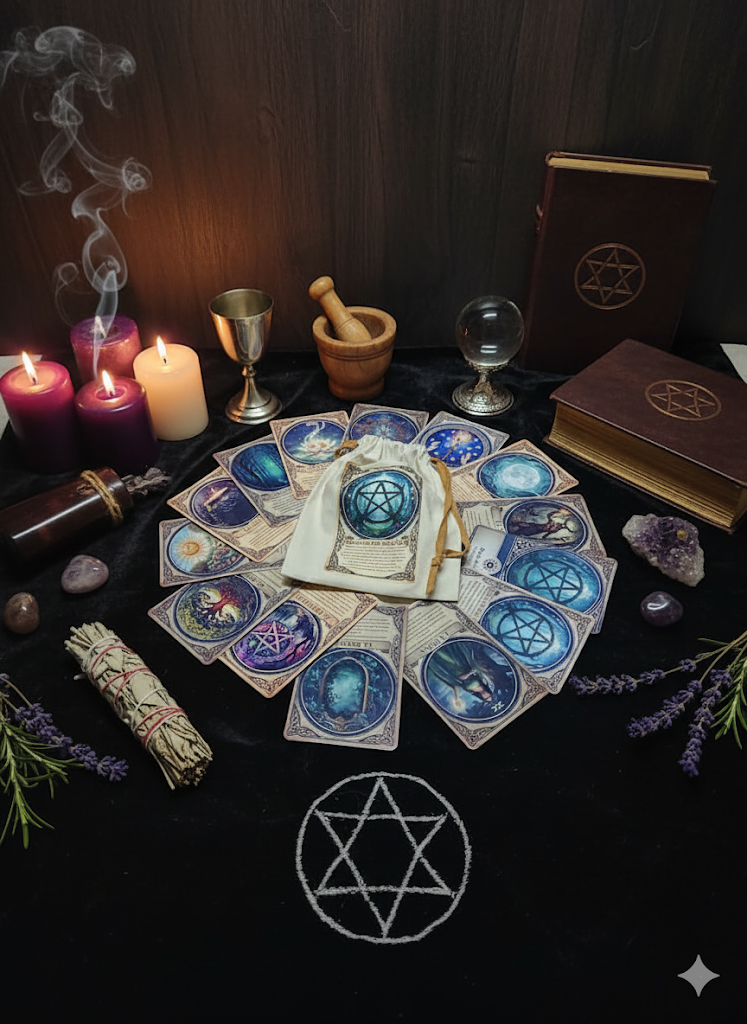 Este oráculo, inspirado en la religión wicca, busca ofrecerte guía espiritual y conexión con la naturaleza y los ciclos cósmicos. Cada carta puede ser utilizada para reflexionar sobre aspectos de tu vida y cómo están interrelacionados con los principios de la magia, la naturaleza y el equilibrio